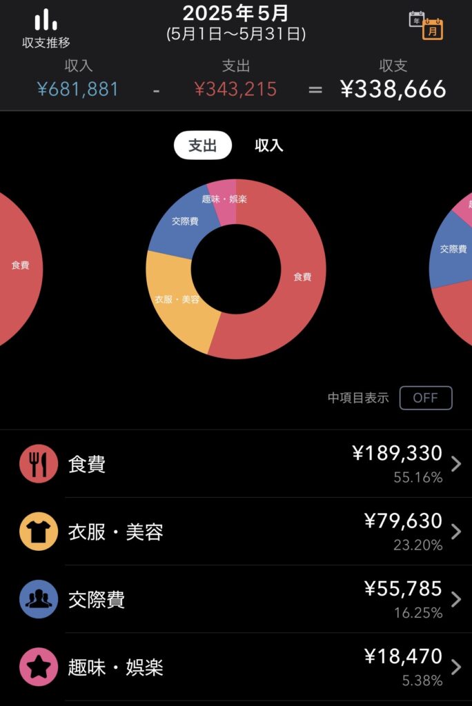 僕の家計簿をマネーフォワード アプリで表示するとこんな感じです。