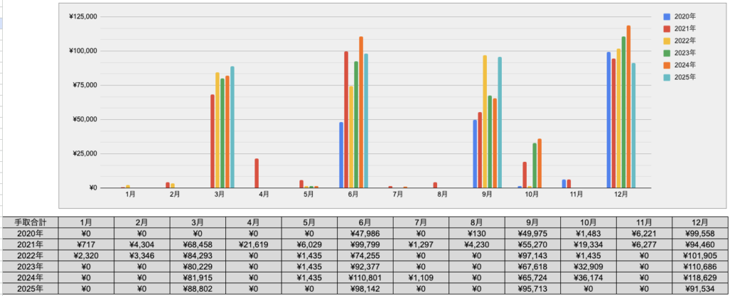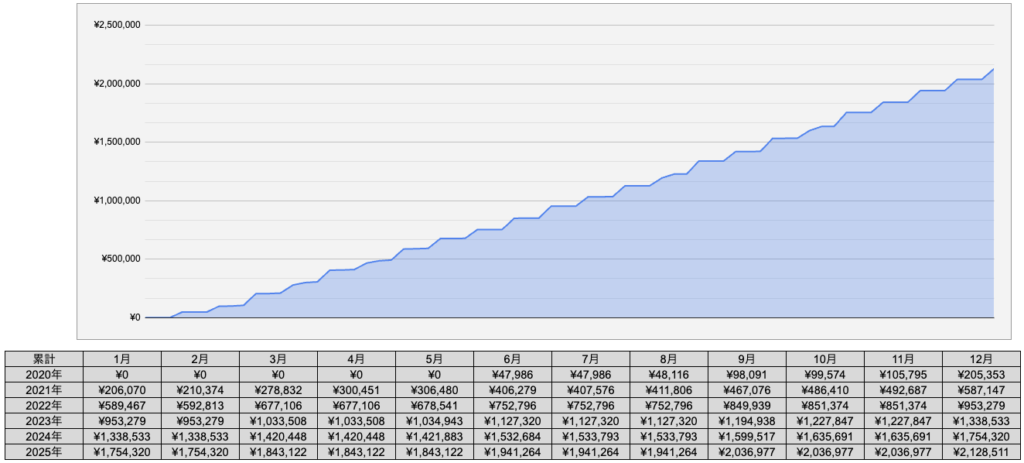 - 累計手取り(2020–2025):¥2,128,511